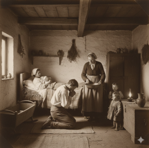 In quelle circostanze tutte “al femminile” i padri venivano allontanati, fatti uscire dalla stanza finché ogni compito non fosse terminato. Quando tutto fu compiuto, Maria chiamò suo figlio dandogli la notizia del lieto evento: il bambino e la mamma stavano bene e tutto era andato per il meglio. Severino, il padre, non ci credeva perché le esperienze passate non erano state positive.