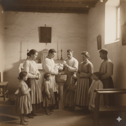 Le prime luci dell’aurora fecero capolino all’orizzonte, specchiandosi sul grande fiume. Erano le cinque del mattino ed entro un’ora bisognava essere in chiesa. Non era una mattina in cui fervevamo chissà quali preparativi: ci si alzava, si faceva colazione con del pane secco ma ci si preparava per il solenne battesimo del piccolo. I genitori, il bambino, la nonna, il padrino e la madrina che erano i vicini di casa, invitati dalla famiglia per presenziare, si recarono in chiesa. Non era di certo una festa in pompa magna, un “gran galà” dell’alta aristocrazia ma soltanto una cerimonia semplice, fatta di poche persone, le più intime. Ci si voleva bene, senza sfarzi, senza fronzoli inutili: una giornata come tante che sarebbe iniziata invece con rito religioso.